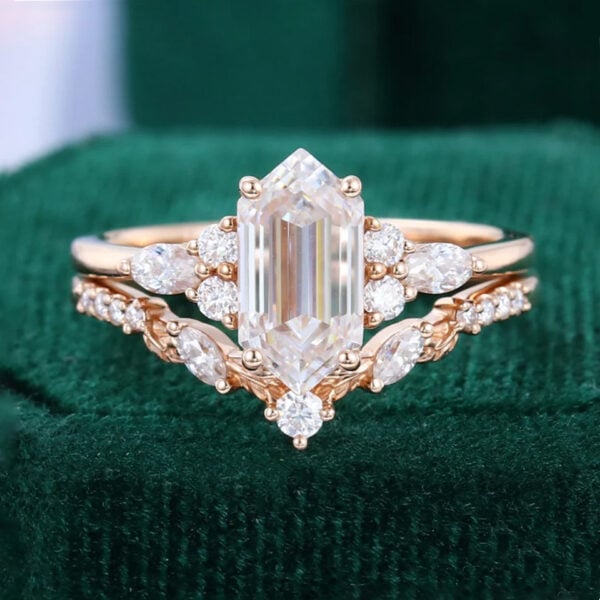 Long Hexagon Cut Moissanite Nature Themed Wedding Ring Set |
